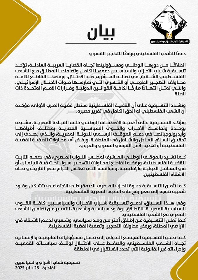 انطلاقًا من دورها الوطني ومسؤوليتها تجاه القضايا العربية العادلة، تؤكد تنسيقية شباب الأحزاب والسياسيين دعمها الكامل وتضامنها المطلق مع الشعب الفلسطيني الشقيق في نضاله المشروع ضد الاحتلال، ورفضها القاطع لكافة محاولات التهجير الطوعي أو القسري التي تمارسها قوات الاحتلال الإسرائيلي، والتي تمثل انتهاكًا صارخًا لكافة القوانين الدولية وقرارات الأمم المتحدة ذات الصلة.