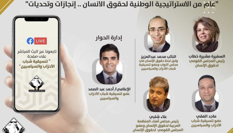 ينظم صالون تنسيقية شباب الأحزاب والسياسيين، غدا الأحد، في تمام الساعة ٧ مساءاً، جلسة نقاشية بعنوان “عام من الاستراتيجية الوطنية لحقوق الإنسان.. إنجازات وتحديات”، بمناسبة مرور عام على إطلاق الاستراتيجية.