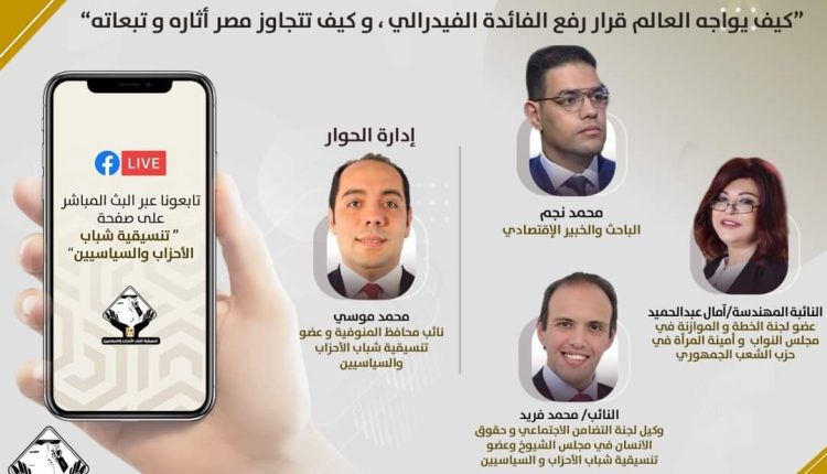 تعقد تنسيقية شباب الأحزاب والسياسيين، غدا الاثنين، في التاسعة مساءا، صالون سياسي بعنوان “كيف يواجه العالم قرار رفع الفائدة الفيدرالي، وكيف تتجاوز مصر آثاره وتبعاته؟”.