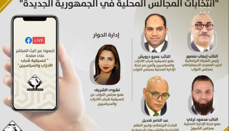في إطار اهتمام تنسيقية شباب الأحزاب والسياسيين بقضايا الوطن والتي سيتم طرحها ومناقشتها خلال جلسات الحوار الوطني المختلفة والتي ستنطلق خلال الفترة المقبلة تعقد تنسيقية شباب الأحزاب والسياسيين صالون نقاشي بعنوان (انتخابات المجالس المحلية في الجمهورية الجديدة) حيث تعد المحليات عصب الرقابة الشعبية المباشرة، لمكافحة الفساد وتطبيق فكرة اللامركزية، وتساهم في وضع رؤية وطريق للتمهيد للوصول إلى الدولة الوطنية الديمقراطية الحديثة، وتفتح التنسيقية للنقاش حول تناقش هذا الموضوع المهم، مع ضيوف من مختلف التيارات السياسية لبحث الأطر المحددة لوضع تصور لإجراء الانتخابات المقبلة.