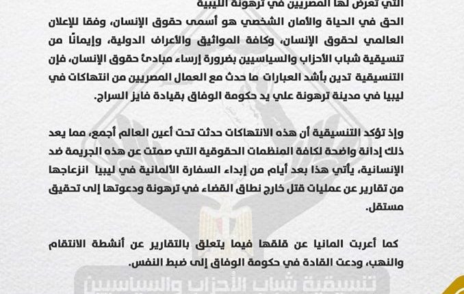 الحق في الحياة والأمان الشخصي هو أسمى حقوق الإنسان، وفقا للإعلان العالمي لحقوق الإنسان، وكافة المواثيق والأعراف الدولية، وإيمانًا من تنسيقية شباب الأحزاب والسياسيين بضرورة إرساء مبادئ حقوق الإنسان، فإن التنسيقية تدين بأشد العبارات ما حدث مع العمال المصريين من انتهاكات في ليبيا في مدينة ترهونة علي يد حكومة الوفاق بقيادة فايز السراج.