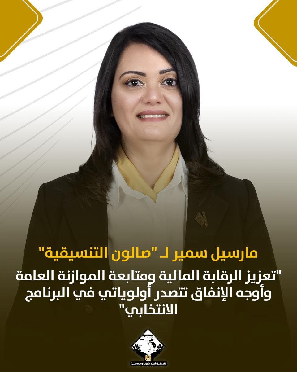 مارسيل سمير لـ “صالون التنسيقية”: تعزيز الرقابة المالية ومتابعة الموازنة العامة وأوجه الإنفاق تتصدر أولوياتي في البرنامج الانتخابي
