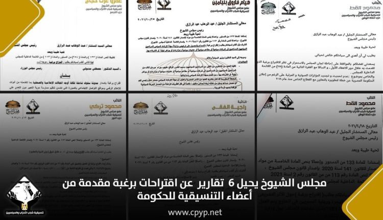 وافق مجلس الشيوخ على إحالة 6 تقارير للجان النوعية عن الاقتراحات برغبة المقدمة من أعضاء تنسيقية شباب الأحزاب والسياسيين للحكومة لإتخاذ اللازم.