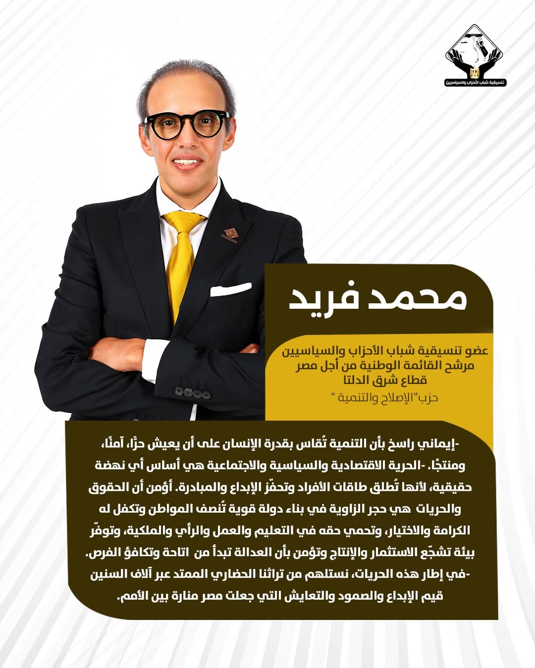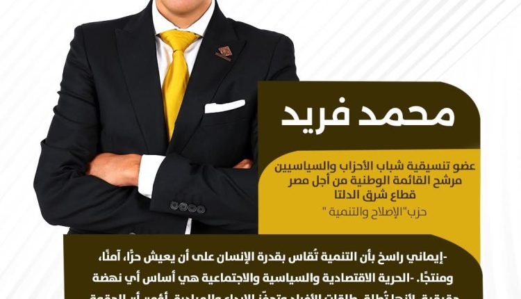 الأخبار محمد فريد بواسطة مدير الموقع في Nov 19, 2025 شارك محمد فريد عضو تنسيقية شباب الأحزاب والسياسيين مرشح القائمة الوطنية من أجل مصر قطاع شرق الدلتا (حزب الإصلاح و التنمية) “-إيماني راسخ بأن التنمية تقاس بقدرة الإنسان على أن يعيش حرًا، آمنًا و منتجًا” شارك FacebookTwitterGoogle+ReddItWhatsAppPinterestالبريد الإلكتروني