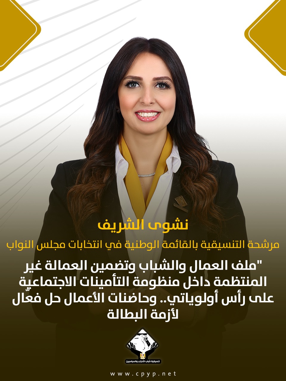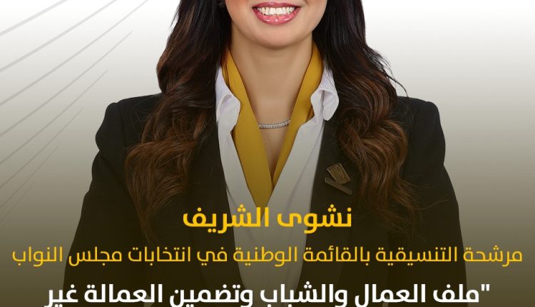 نشوى الشريف مرشحة التنسيقية بالقائمة الوطنية في انتخابات مجلس النواب: ملف العمال والشباب وتضمين العمالة غير المنتظمة داخل منظومة التأمينات الاجتماعية على رأس أولوياتي.. وحاضنات الأعمال حل فعّال لأزمة البطالة
