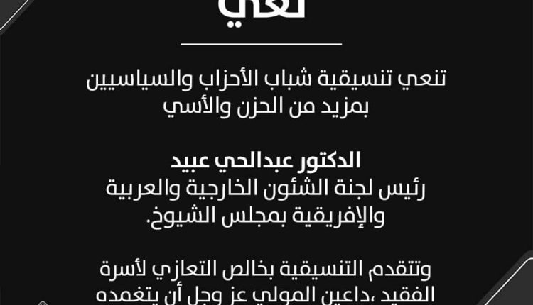 تنعي تنسيقية شباب الأحزاب والسياسيين بمزيد من الحزن والأسي الدكتور عبدالحي عبيد رئيس لجنة الشئون الخارجية والعربية والإفريقية بمجلس الشيوخ.