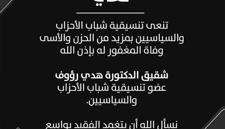‏تنعى تنسيقية شباب الأحزاب والسياسيين بمزيد من الحزن والأسى وفاة المغفور له بإذن الله شقيق الدكتورة هدى رؤوف عضو تنسيقية شباب الأحزاب والسياسيين.