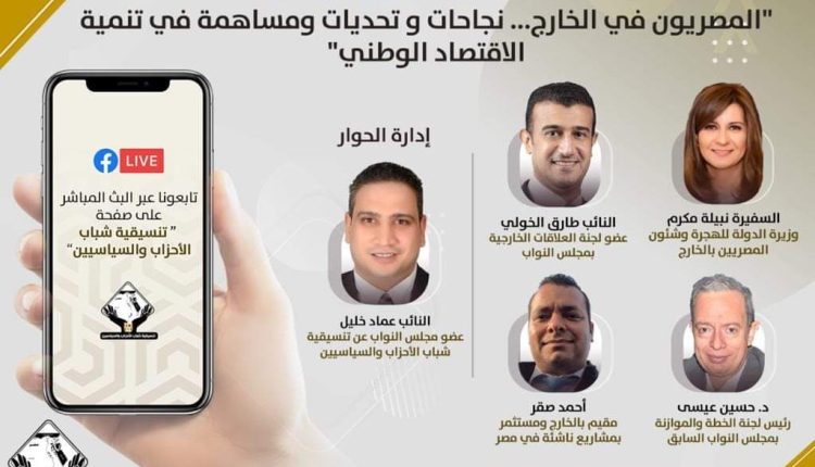 يستضيف صالون تنسيقية شباب الأحزاب والسياسيين الذي يعقد اليوم الساعة السابعة مساء ويبث عبر صفحة تنسيقية شباب الأحزاب والسياسيين على فيسبوك وزيرة الهجرة السفيرة نبيلة مكرم وذلك للحديث عن استراتيجية التواصل والاتصال مع المصريين في الخارج التي أطلقتها الوزارة مؤخرا بالإضافة إلى الحديث عن مساهمات المصريين في الخارج في تنمية الاقتصاد الوطني والعقبات التي تواجه بعضهم في الاستثمار واقتراح حلول لها ومن المقرر أن يستضيف الصالون بجانب الوزيرة لتوسعة دائرة النقاش والمشاركة من المتخصيين وكافة الأطراف النائب طارق الخولي عضو لجنة العلاقات الخارجية بمجلس النواب والدكتور حسين عيسى رئيس لجنة الخطة والموازنة بمجلس النواب السابق والاستاذ أحمد صقر المقيم بالخارج والمستثمر بمشاريع ناشئة في مصر ويقوم على إدارة الصالون النائب والكاتب الصحفي عماد خليل عضو تنسيقية شباب الأحزاب والسياسيين.